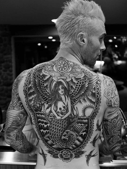 "adam levine has a huge mermaid holding a skull on his back." "adam levine shows off massive back tattoo that took 6 months to finish" "after six months, the singer has finally debuted the finished product" see more. Twitter users are left convinced that one of adam levine's tattoos spells the word 'bro' by using his nipple as the 'o' (so can you guess what the ink really means?) as he is 'back in contact. Levine’s instagram account provides an insight into his largest tattoo, a statement piece of body art on his back which depicts a mermaid cradling a skull. the inking was created by california-based tattoo artist bryan randolph..